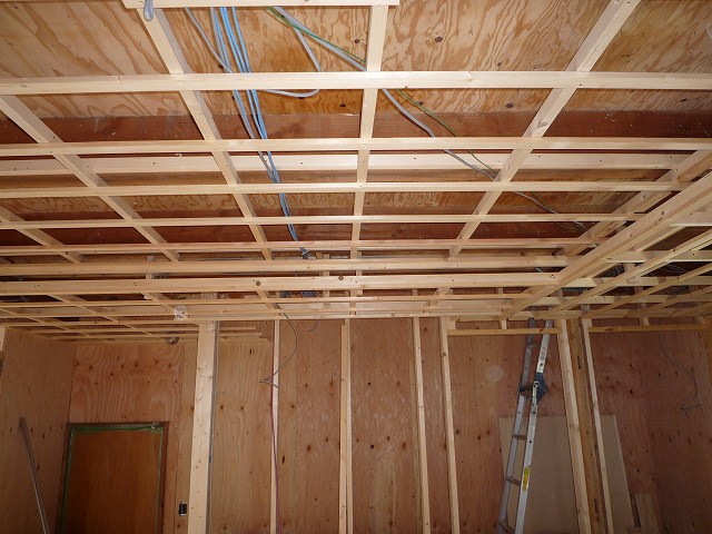 床は構造用合板を張り、天井の下地組をしてプラスターボード張りをして