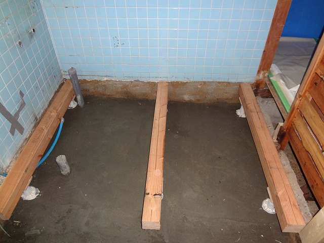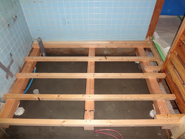 床の下地組です。最初にプラ束を建てて、その上に大引を置いた所です。