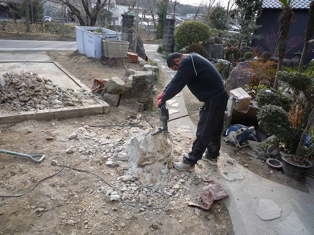 大きな石が邪魔になるので、斫っています。最初は、大きい石なので