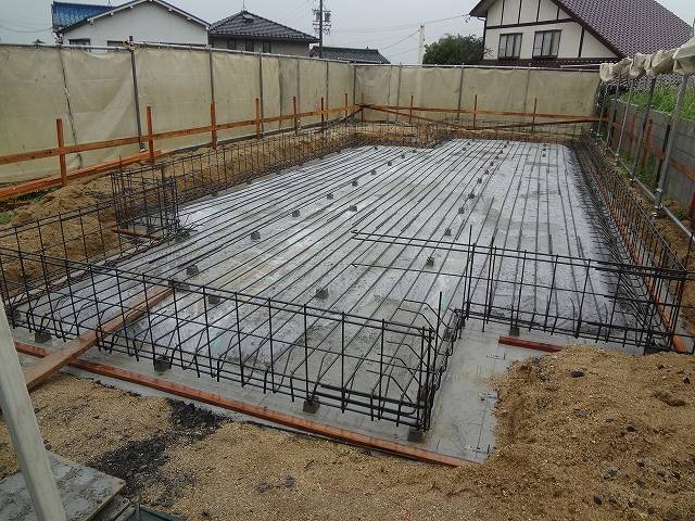 外周の鉄筋を組みました。鉄筋の下に角のコンクリートを敷き、