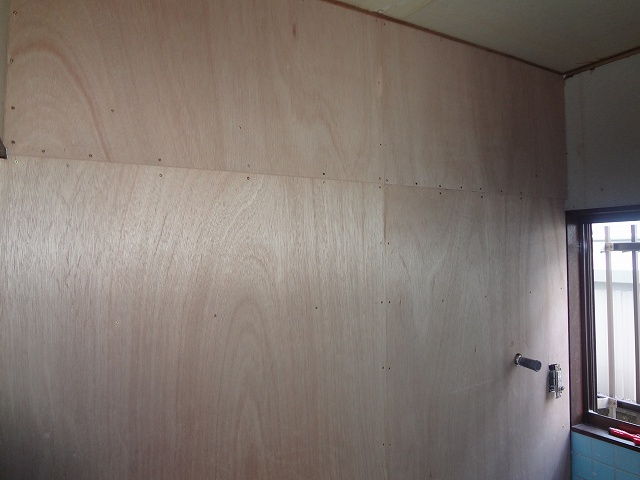 壁一面のベニヤ貼りが終わりました。タイルが貼ってあった部分だけ貼り替え