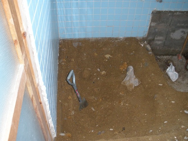 タイルをハツリ終わって、ユニットバスの架台の分まで土を取っています。