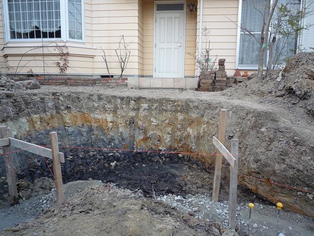 ブロックを積む下地部分のベースに砕石を入れています。アールの部分が、