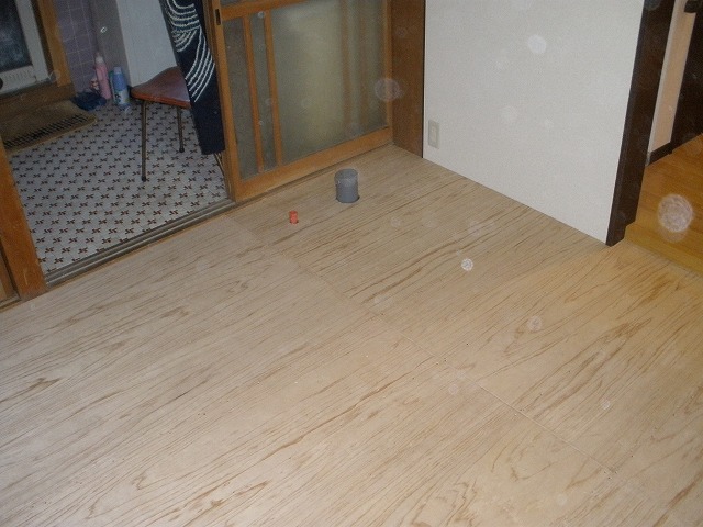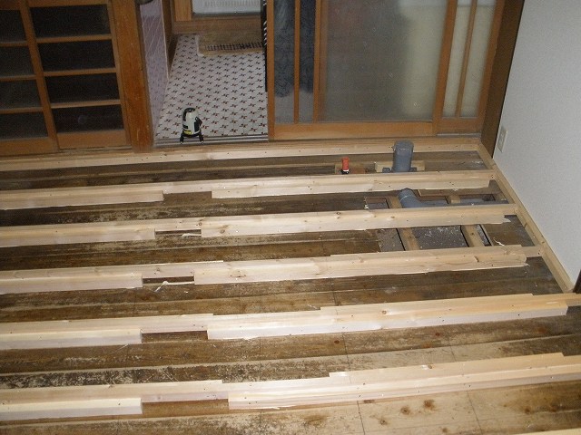 今日は、通路部分全体の床下地組とベニヤ張りの工事です。