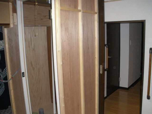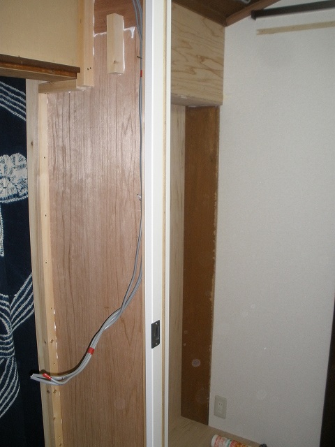 トイレと廊下の間仕切を建てて、電気配線を入れていきます。