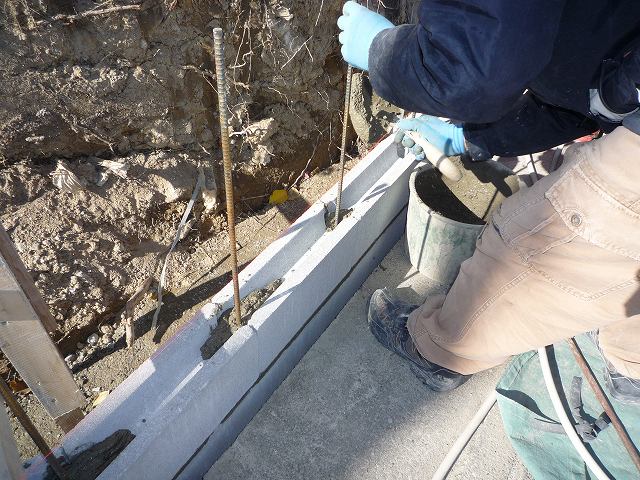ブロックを積み縦の鉄筋との隙間にモルタル(セメント)を入れています。