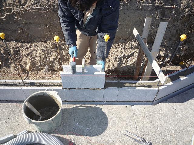 今日からブロック積み工事が始まりました。積み方の様子を紹介します。