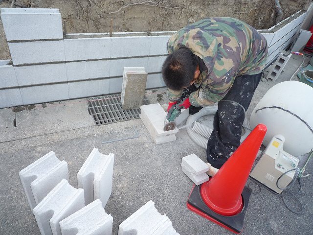 ブロックをグラインダーで切っている様子です。